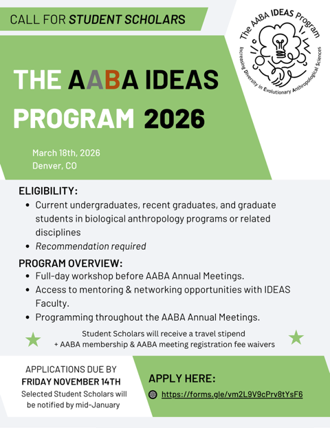 Fill out the Student Scholars application (https://forms.gle/RLMUZ45AhcW3cgoz7) by Friday, November 14, 2025, by midnight EST. Applicants must be graduate or undergraduate students in biological anthropology or related disciplines. Complete applications must include the name of a recommender (see below).