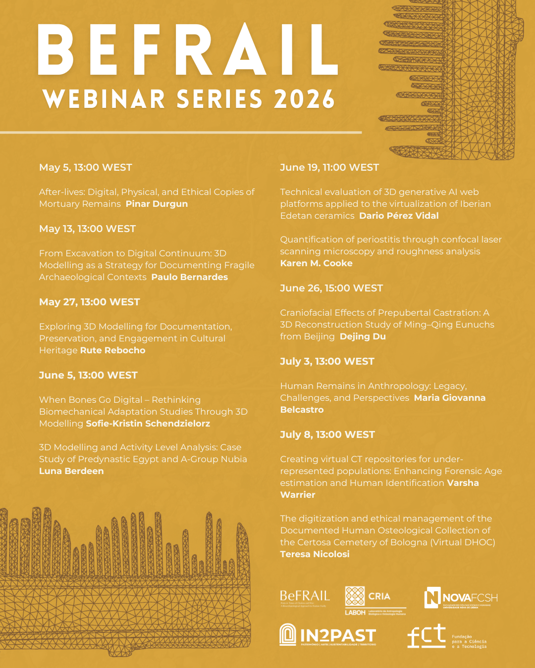 We are very happy to announce that the third BeFRAIL webinar series titled “Digital frailty: the role of 3D modelling in bioanthropology, archaeology and heritage” will be taking place this year between