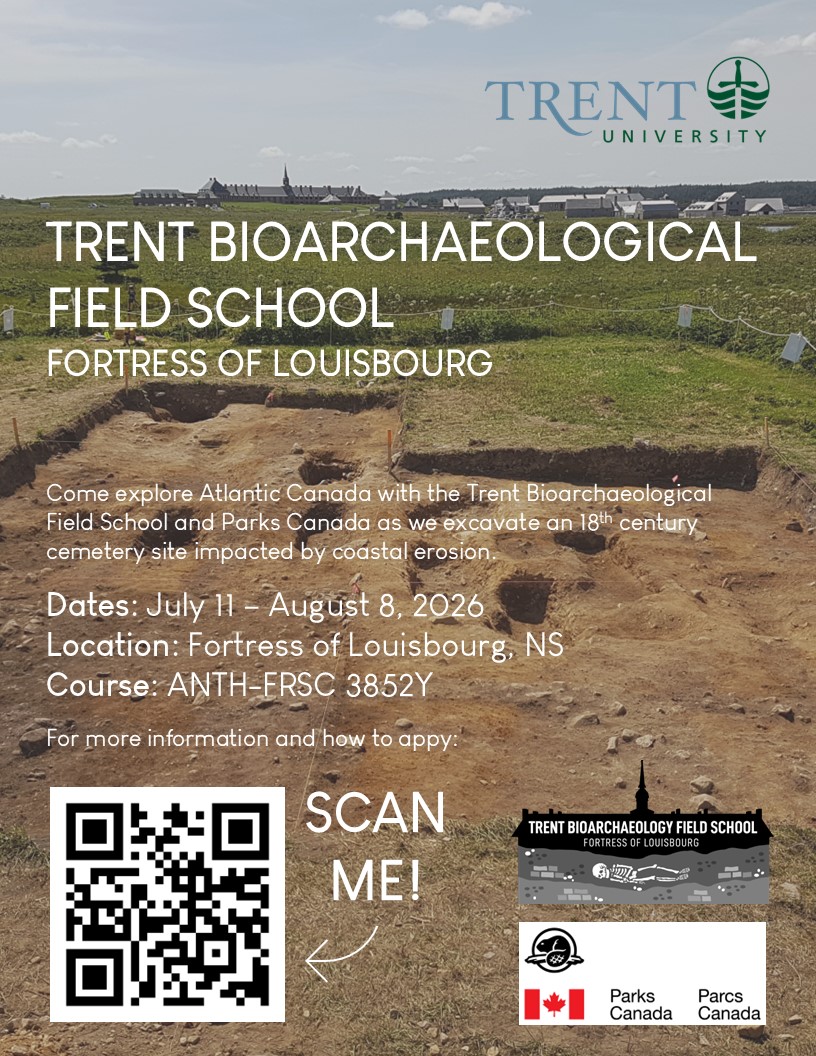Continuing in 2026, the Trent Bioarchaeology Field School will be offering students an exciting, one-of-a-kind Canadian field experience. Established in 2017 under the direction of Dr. Amy Scott, this field school program is offered by the Department of Anthropology at Trent University in partnership with Parks Canada, at the Fortress of Louisbourg, National Historic Site of Canada.