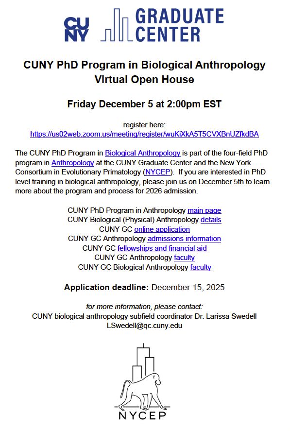 The CUNY PhD Program in Biological Anthropology is part of the four-field PhD program in Anthropology at the CUNY Graduate Center and the New York Consortium in Evolutionary Primatology (NYCEP). If you are interested in PhD level training in biological anthropology, please join us on December 5th to learn more about the program and process for 2026 admission.