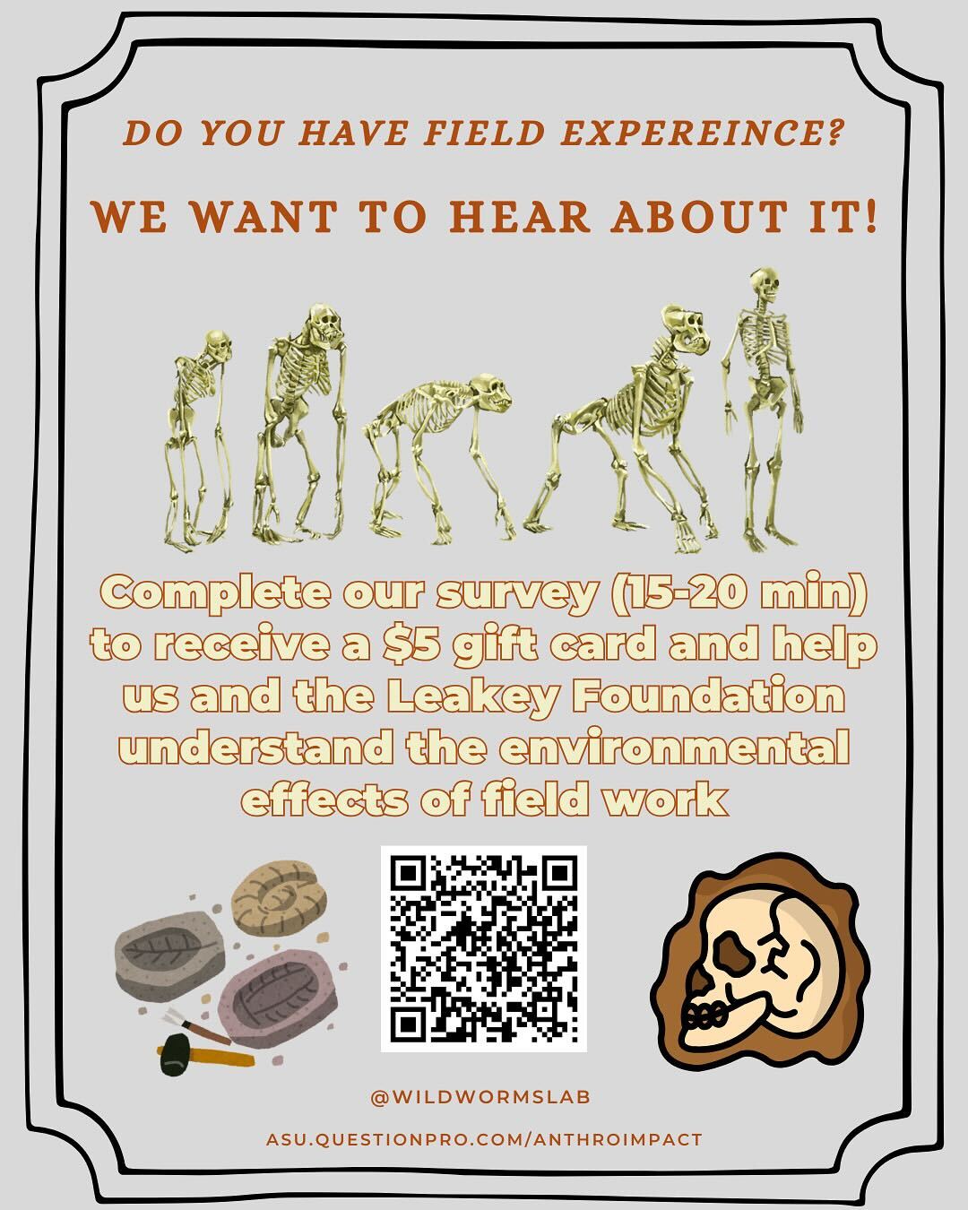 We’re partnering with the Leakey Foundation to better understand how anthropologists impact the environment during fieldwork. To do this, we’ve created a short survey (15–20 minutes) with the option of a $5 gift card at the end.
